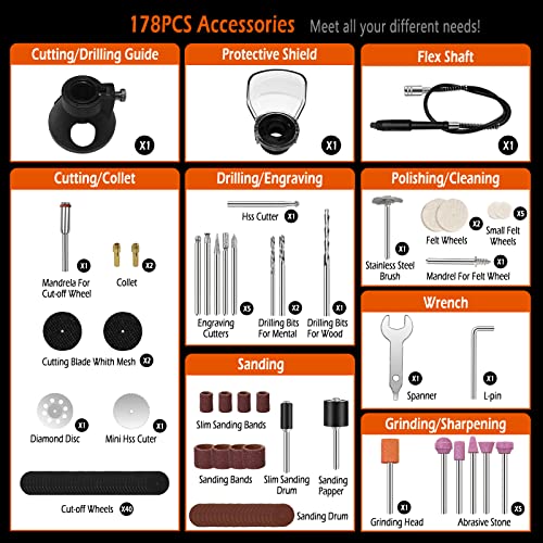 【178 Various Accessories】178 high-quality and commonly used accessories, including 2 protective covers, 2 polishing tools, 3 grinding tools, 4 cutting tools, 8 drilling tools and 6 sanding tools, which can meet all your DIY needs. Two protective covers are included to protect you when cutting, sanding and drilling. Two different collets, 2.3mm and 3.2mm, are included to fit most brand rotary tool accessories.