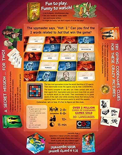 Codenames is a social word game with a simple premise and challenging game play. Two rival spymasters know the secret identities of 25 agents. Their teammates know the agents only by their codenames. The teams compete to see who can make contact with all of their agents first. Spymasters give one-word clues that can point to multiple words on the table. Their teammates try to guess words of their color while avoiding those that belong to the opposing team. And everyone wants to avoid the assassin. The game works very well with 4 players if you prefer to guess without help. Or you can add more players if you prefer lively discussion. There is also a cooperative variant where a single team tries to achieve the highest score they can by playing against the game itself.