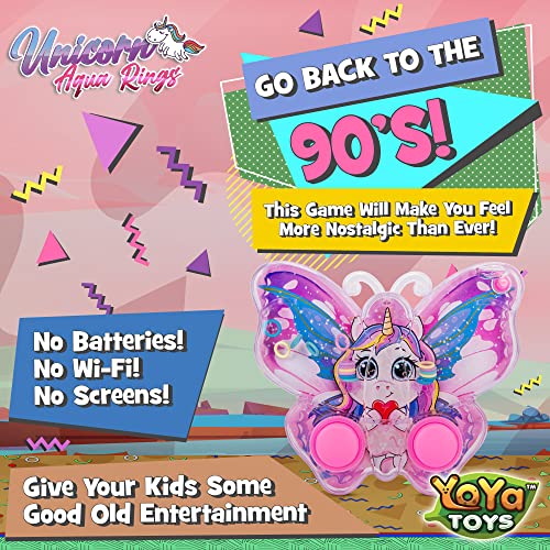 A Nostalgic Blast from the Past: Let kids experience what “fun” was like back in the old days! No gadgets, no glowing screens – our handheld water games are a great way to cut off that boredom and stir up a little bit of challenge! Aqua Rings Unicorn Butterfly game has a cool 80’s / 90’s vintage vibe!